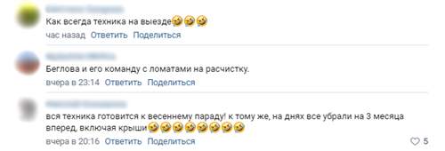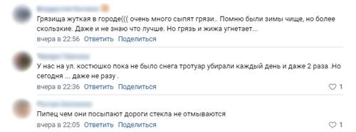 В комментариях также отмечают, что в отдельных районах уборка проводилась. Однако в минувшие сутки техника не работала. При этом соль не работает. Она только создает дополнительную грязь.