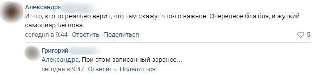 Кроме того, многие пользователи Сети считают, что Беглов не будет отвечать на наиболее волнующие всех петербуржцев вопросы, ограничившись только удобными для себя темами.
