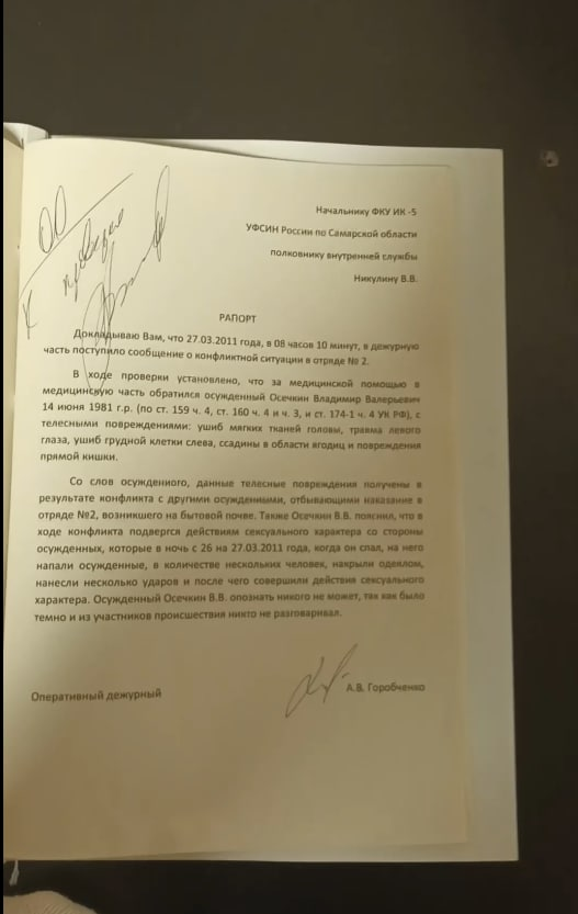 Правозащитника и основателя проекта Gulagu.Net Владимира Осечкина изнасиловали во время отбывания наказания ИК-5 в Самарской области. Об этом говорят фото его дела и обращение, датированное 2011 годом. Это случилось за три месяца до его выхода по УДО.